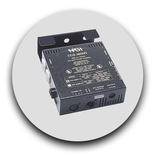 DESCRIPTION : Pack de relais pouvant contrôler des éclairages en DMX. 4 entrées de 15 ampères (600 watts maximum) avec un maximum de 1800 Watts total.
